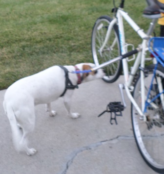 I moved the bike outside the front door, all ready to go. My son walked Phoebe out and hooked up the harness. Phoebe was not scared (tail between her legs and cowering), nor was she excited. I figured it best to just get going. I was on the bike and walked it a down the driveway to give her a feel for following along with the bike. Then I started to peddle very slowly until she got in the groove. Once she looked like she was in to it, I picked up speed and Phoebe was able to trot alongside me. Then she took it upon herself to start running. Now she was in control, because I had to bike faster in order to let her continue at her running pace (she can run pretty darn fast)! At that point it was like who is exercising who?