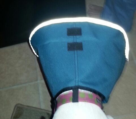 The Pro Collar lets you choose between using a Velcro attachment (provided), and using your dog’s regular collar. I opted to use Phoebe’s regular collar because it makes it easy to snap on and snap off. The cone was easy to adjust and provides an option to adjust how wide you want it to be.
