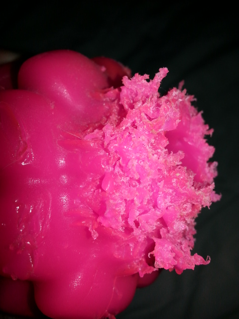 Look at this little pink football thingy. It is made out of hard, hard, super hard plastic. She had it 15 minutes and managed to chew off one end, and was shredding stuff off the sides.