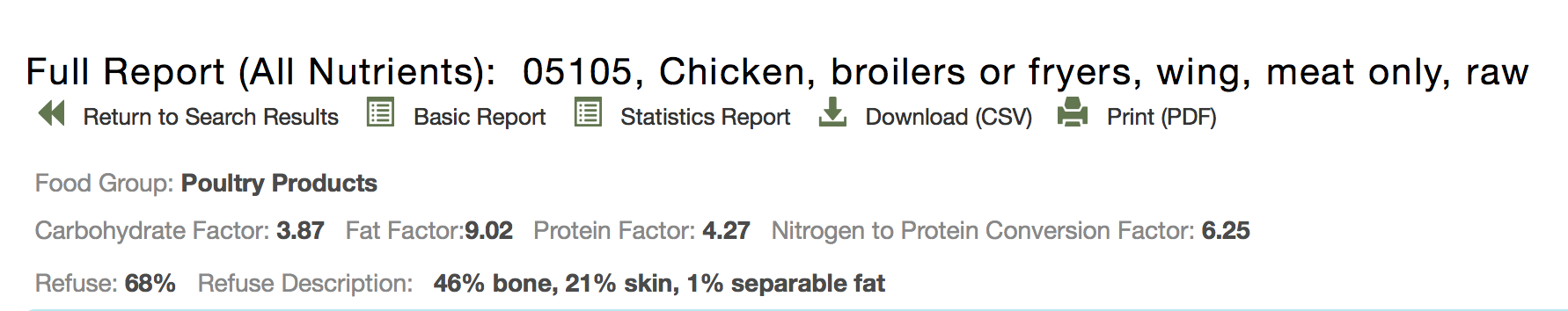 Looking at the screen shot provided by a reader (below), which is from the same database, a chicken wing contains for 68% refuse (46% bone, 21% skin and 1% separable fat).
